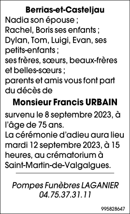 Décédé à Berrias-et-Casteljau (07460, France) le vendredi 8 septembre 2023 à l'âge de 75 ans