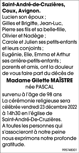 Décédée à Saint-André-de-Cruzières (07460, France) le lundi 19 décembre 2022 à l'âge de 98 ans