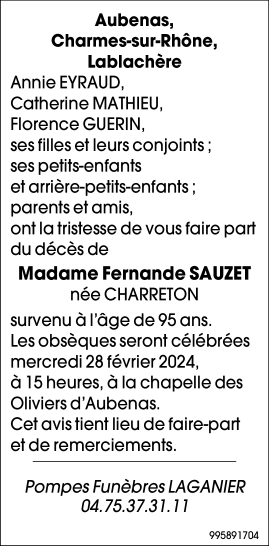 Décédée à Lablachère (07230, France) le samedi 24 février 2024 à l'âge de 95 ans