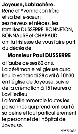 Décédé à Joyeuse (07260, France) le lundi 24 avril 2023 à l'âge de 81 ans