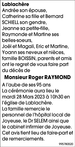 Décédé à Joyeuse (07260, France) le jeudi 23 mars 2023 à l'âge de 94 ans