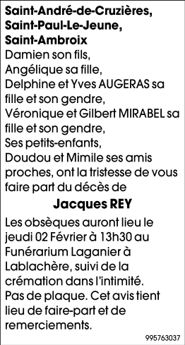 Décédé à Saint-André-de-Cruzières (07460, France) le dimanche 29 janvier 2023 à l'âge de 80 ans