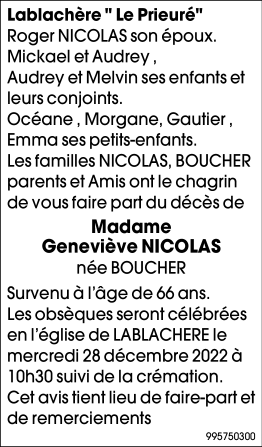 Décédée à Joyeuse (07260, France) le samedi 24 décembre 2022 à l'âge de 66 ans